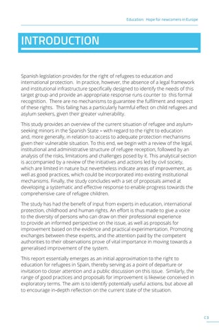 INTRODUCTION Spanish legislation provides for the right of refugees to education and international protection. In practice, however, the absence of a legal framework and institutional infrastructure specifically designed to identify the needs of this target group and provide an appropriate response runs counter to this formal recognition. There are no mechanisms to guarantee the fulfilment and respect of these rights. This failing has a particularly harmful effect on child refugees and asylum seekers, given their greater vulnerability. This study provides an overview of the current situation of refugee and asylumseeking minors in the Spanish State – with regard to the right to education and, more generally, in relation to access to adequate protection mechanisms given their vulnerable situation. To this end, we begin with a review of the legal, institutional and administrative structure of refugee reception, followed by an analysis of the risks, limitations and challenges posed by it. This analytical section is accompanied by a review of the initiatives and actions led by civil society, which are limited in nature but nevertheless indicate areas of improvement, as well as good practices, which could be incorporated into existing institutional mechanisms. Finally, the study concludes with a set of proposals aimed at developing a systematic and effective response to enable progress towards the comprehensive care of refugee children. The study has had the benefit of input from experts in education, international protection, childhood and human rights. An effort is thus made to give a voice to the diversity of persons who can draw on their professional experience to provide an informed perspective on the issue, as well as proposals for improvement based on the evidence and practical experimentation. Promoting exchanges between these experts, and the attention paid by the competent authorities to their observations prove of vital importance in moving towards a generalised improvement of the system. This report essentially emerges as an initial approximation to the right to education for refugees in Spain, thereby serving as a point of departure or invitation to closer attention and a public discussion on this issue. Similarly, the range of good practices and proposals for improvement is likewise conceived in exploratory terms. The aim is to identify potentially useful actions, but above all to encourage in-depth reflection on the current state of the situation.