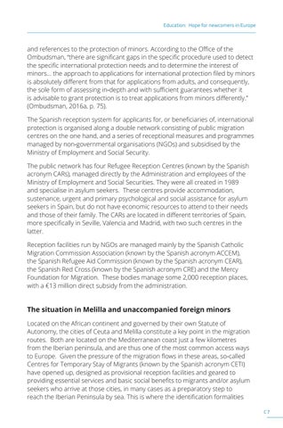 The situation in Melilla and unaccompanied foreign minors Located on the African continent and governed by their own Statute of Autonomy, the cities of Ceuta and Melilla constitute a key point in the migration routes. Both are located on the Mediterranean coast just a few kilometres from the Iberian peninsula, and are thus one of the most common access ways to Europe. Given the pressure of the migration flows in these areas, so-called Centres for Temporary Stay of Migrants (known by the Spanish acronym CETI) have opened up, designed as provisional reception facilities and geared to providing essential services and basic social benefits to migrants and/or asylum seekers who arrive at those cities, in many cases as a preparatory step to reach the Iberian Peninsula by sea. This is where the identification formalities C7