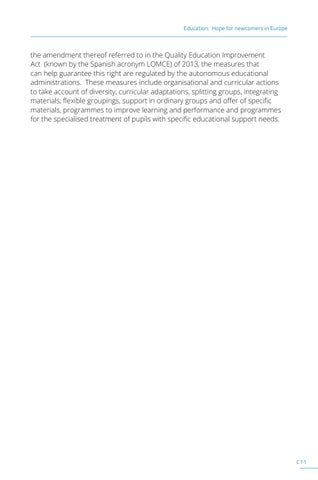 the amendment thereof referred to in the Quality Education Improvement Act (known by the Spanish acronym LOMCE) of 2013, the measures that can help guarantee this right are regulated by the autonomous educational administrations. These measures include organisational and curricular actions to take account of diversity, curricular adaptations, splitting groups, integrating materials, flexible groupings, support in ordinary groups and offer of specific materials, programmes to improve learning and performance and programmes for the specialised treatment of pupils with specific educational support needs.