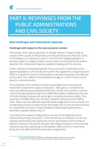 PART II: RESPONSES FROM THE PUBLIC ADMINISTRATIONS AND CIVIL SOCIETY Main challenges and institutional responses Challenges with respect to the socio-economic context The analysis of the right to education of refugee children in Spain entails an analysis of the causes of child poverty and educational poverty (FECCOO, 2016). In this respect, it is important to bear in mind that the refugee population is arriving in Spain in a highly complex social context characterised by the relative absence of an institutional response capable of dealing with this scenario. A clear indication of the growing levels of socio-economic vulnerability of the Spanish population is the risk of poverty which has registered a rising trend since 2009. It is significant that the child population has been the group most affected by this trend. Thus, 40% of minors between the age of 12 and 17 are at risk of poverty or social exclusion. The complexity of this situation has been exacerbated by the low levels of investment in policies for equity in education – although it is considered the most cost-effective social investment (FECCOO, 2015a). The economic crisis the country has been going through since 2008 has entailed a substantial reduction of funds intended to guarantee social rights, including educational rights. Thus, more than €10,000 million has not been invested in education from 2009 to 2016. These cuts have affected especially those budget items that are clearly of a compensatory nature (Consejo Escolar del Estado, 2017), such as those intended for scholarships and aids or those intended to boost equal opportunities – described in greater detail in Box 2.6 According to the analysis of Miguel Recio, director of the Vegal del Jarama Institute of Secondary Education, in 2012 the Ministry of Education cut the vast majority of essential funds used by the various Autonomous Communities to attend to diversity. The quantity of public spending on diversity in non-university education was thus reduced by 55.4% between 2009 and 2012- these items being the most affected of all the education programmes.