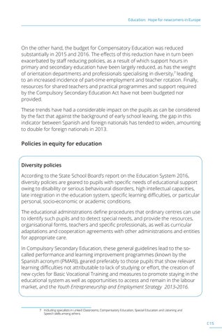 On the other hand, the budget for Compensatory Education was reduced substantially in 2015 and 2016. The effects of this reduction have in turn been exacerbated by staff reducing policies, as a result of which support hours in primary and secondary education have been largely reduced, as has the weight of orientation departments and professionals specialising in diversity,7 leading to an increased incidence of part-time employment and teacher rotation. Finally, resources for shared teachers and practical programmes and support required by the Compulsory Secondary Education Act have not been budgeted nor provided. These trends have had a considerable impact on the pupils as can be considered by the fact that against the background of early school leaving, the gap in this indicator between Spanish and foreign nationals has tended to widen, amounting to double for foreign nationals in 2013.