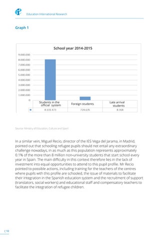 In a similar vein, Miguel Recio, director of the IES Vega del Jarama, in Madrid, pointed out that schooling refugee pupils should not entail any extraordinary challenge nowadays, in as much as this population represents approximately 0.1% of the more than 8 million non-university students that start school every year in Spain. The main difficulty in this context therefore lies in the lack of investment into equal opportunities to attend to this pupil profile. Mr Recio pointed to possible actions, including training for the teachers of the centres where pupils with this profile are schooled, the issue of materials to facilitate their integration in the Spanish education system and the recruitment of support (translators, social workers) and educational staff and compensatory teachers to facilitate the integration of refugee children.