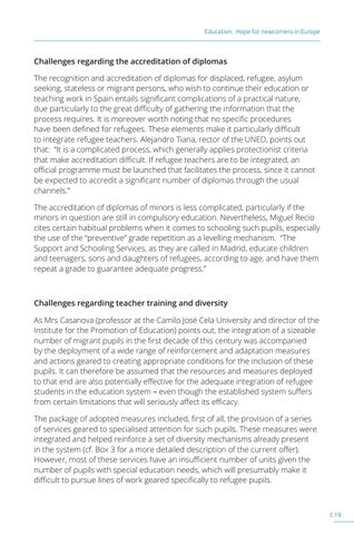Challenges regarding teacher training and diversity As Mrs Casanova (professor at the Camilo José Cela University and director of the Institute for the Promotion of Education) points out, the integration of a sizeable number of migrant pupils in the first decade of this century was accompanied by the deployment of a wide range of reinforcement and adaptation measures and actions geared to creating appropriate conditions for the inclusion of these pupils. It can therefore be assumed that the resources and measures deployed to that end are also potentially effective for the adequate integration of refugee students in the education system – even though the established system suffers from certain limitations that will seriously affect its efficacy. The package of adopted measures included, first of all, the provision of a series of services geared to specialised attention for such pupils. These measures were integrated and helped reinforce a set of diversity mechanisms already present in the system (cf. Box 3 for a more detailed description of the current offer). However, most of these services have an insufficient number of units given the number of pupils with special education needs, which will presumably make it difficult to pursue lines of work geared specifically to refugee pupils.