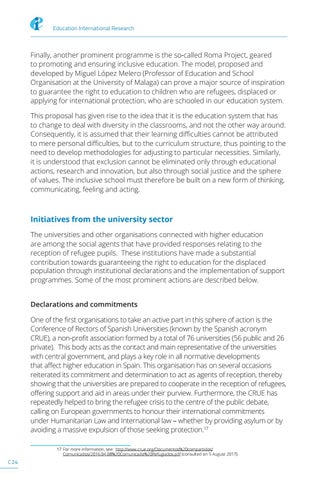 Initiatives from the university sector The universities and other organisations connected with higher education are among the social agents that have provided responses relating to the reception of refugee pupils. These institutions have made a substantial contribution towards guaranteeing the right to education for the displaced population through institutional declarations and the implementation of support programmes. Some of the most prominent actions are described below. Declarations and commitments One of the first organisations to take an active part in this sphere of action is the Conference of Rectors of Spanish Universities (known by the Spanish acronym CRUE), a non-profit association formed by a total of 76 universities (56 public and 26 private). This body acts as the contact and main representative of the universities with central government, and plays a key role in all normative developments that affect higher education in Spain. This organisation has on several occasions reiterated its commitment and determination to act as agents of reception, thereby showing that the universities are prepared to cooperate in the reception of refugees, offering support and aid in areas under their purview. Furthermore, the CRUE has repeatedly helped to bring the refugee crisis to the centre of the public debate, calling on European governments to honour their international commitments under Humanitarian Law and International law – whether by providing asylum or by avoiding a massive expulsion of those seeking protection.17 17 For more information, see: http://www.crue.org/Documentos%20compartidos/ Comunicados/2016.04.08%20Comunicado%20Refugiados.pdf (consulted on 5 August 2017).