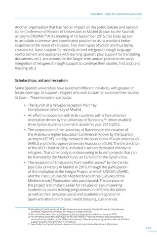 Another organisation that has had an impact on the public debate and opinion is the Conference of Rectors of Universities in Madrid (known by the Spanish acronym (CRUMA).18 At its meeting of 16 September 2015, this body agreed to articulate a common and coordinated position so as to provide a better response to the needs of refugees. Two main types of action are thus being considered: basic support for recently arrived refugees (through language reinforcement and assistance with learning Spanish, plus support for translating documents, etc.), and actions for the longer term and/or geared to the social integration of refugees (through support to continue their studies, find a job and housing, etc.). Scholarships, aid and reception Some Spanish universities have launched different initiatives, with greater or lesser coverage, to support refugees who wish to start or continue their studies in Spain. These include in particular: • The launch of a Refugee Reception Plan19 by Complutense University of Madrid. • An effort to cooperate with Arab countries with a humanitarian orientation driven by the University of Barcelona,20 which enabled three Syrian students to enrol in academic year 2015-2016. • The cooperation of the University of Barcelona in the creation of the Arab-Euro Higher Education Conference (known by the Spanish acronym AECHE), a bridge between the Association of Arab Universities (AARU) and the European University Association (EUA). The third edition of the AECH, held in 2016, included a section dedicated entirely to refugees. That same body is endeavouring to launch projects that can be financed by the Madad Fund, an EU fund for the Syrian crisis. • The reception of 10 students from conflict zones21 by the Camilo José Cela University in Madrid in 2016, through the participation of this institution in the Integra Project, in which UNICEF, UNHRC, and the Tres Culturas del Mediterráneo [Three Cultures of the Mediterranean] Foundation also participated. The purpose of the project is to make it easier for refugee or asylum seeking students to access training programmes in different disciplines as well as their personal, social and academic integration in Spain and attention to basic needs (housing, sustenance). 18 Consisting of the University of Alcalá, the Autonomous Univerity, Charles II University, Complutense University, Polytechnic University, and King Juan Carlos University. 19 For more information, see: http://www.ucm.es/ucmrefugiadas (consulted on 5 August 2017). 20 The University of Barelona stands out for its track record in receiving forcefully displaced person or victims of armed conflicts. In the 1990s, the University of Barcelona signed agreements with the ACSAR to support students fleeing the War in the Balcans. 21 Specifically, from Syria (Damascus, Aleppo and Homs), Iraq, Ukraine (Xercoh) and Afghanistan.