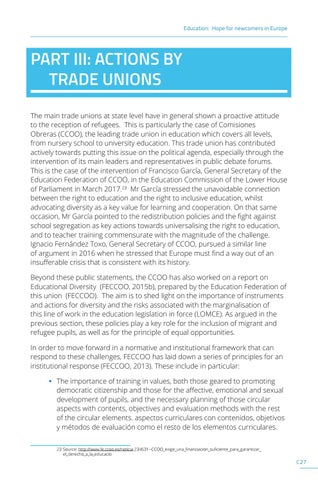 PART III: ACTIONS BY TRADE UNIONS The main trade unions at state level have in general shown a proactive attitude to the reception of refugees. This is particularly the case of Comisiones Obreras (CCOO), the leading trade union in education which covers all levels, from nursery school to university education. This trade union has contributed actively towards putting this issue on the political agenda, especially through the intervention of its main leaders and representatives in public debate forums. This is the case of the intervention of Francisco García, General Secretary of the Education Federation of CCOO, in the Education Commission of the Lower House of Parliament in March 2017.23 Mr García stressed the unavoidable connection between the right to education and the right to inclusive education, whilst advocating diversity as a key value for learning and cooperation. On that same occasion, Mr García pointed to the redistribution policies and the fight against school segregation as key actions towards universalising the right to education, and to teacher training commensurate with the magnitude of the challenge. Ignacio Fernández Toxo, General Secretary of CCOO, pursued a similar line of argument in 2016 when he stressed that Europe must find a way out of an insufferable crisis that is consistent with its history. Beyond these public statements, the CCOO has also worked on a report on Educational Diversity (FECCOO, 2015b), prepared by the Education Federation of this union (FECCOO). The aim is to shed light on the importance of instruments and actions for diversity and the risks associated with the marginalisation of this line of work in the education legislation in force (LOMCE). As argued in the previous section, these policies play a key role for the inclusion of migrant and refugee pupils, as well as for the principle of equal opportunities. In order to move forward in a normative and institutional framework that can respond to these challenges, FECCOO has laid down a series of principles for an institutional response (FECCOO, 2013). These include in particular: • The importance of training in values, both those geared to promoting democratic citizenship and those for the affective, emotional and sexual development of pupils, and the necessary planning of those circular aspects with contents, objectives and evaluation methods with the rest of the circular elements. aspectos curriculares con contenidos, objetivos y métodos de evaluación como el resto de los elementos curriculares. 23 Source: http://www.fe.ccoo.es/noticia:234631--CCOO_exige_una_financiacion_suficiente_para_garantizar_ el_derecho_a_la_educacio