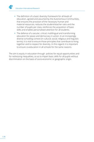 • The definition of a basic diversity framework for all levels of education, agreed and assumed by the Autonomous Communities, that ensures the provision of the necessary human and material resources, reduces the student/teacher ratio and the number of pupils per class, reinforces the acquisition of basic skills and enables personalised attention for all students. • The defence of a secular, critical, multilingual and transforming education for peace and democracy in action. In an increasingly diverse schooling context (in cultural, social, religious and linguistic terms), it is vital to ensure those principles that contribute to living together and to respect for diversity. In this regard, it is important to ensure co-education in all schools for the same reasons. The aim is equity in education through policies for equal opportunities and for redressing inequalities, so as to impart basic skills for all pupils without discrimination on the basis of socio-economic or geographic origin.