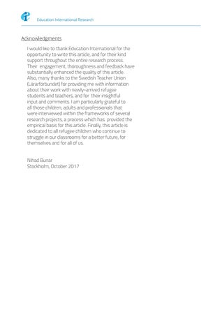 Acknowledgments I would like to thank Education International for the opportunity to write this article, and for their kind support throughout the entire research process. Their engagement, thoroughness and feedback have substantially enhanced the quality of this article. Also, many thanks to the Swedish Teacher Union (LärarfÜrbundet) for providing me with information about their work with newly-arrived refugee students and teachers, and for their insightful input and comments. I am particularly grateful to all those children, adults and professionals that were interviewed within the frameworks of several research projects, a process which has provided the empirical basis for this article. Finally, this article is dedicated to all refugee children who continue to struggle in our classrooms for a better future, for themselves and for all of us. Nihad Bunar Stockholm, October 2017