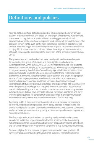 Definitions and policies Prior to 2016, no official definition existed of who constituted a newly arrived student in Swedish schools (i.e. based on the length of residence). Furthermore, there were no regulations at national level providing guidance for local educational authorities on how to organise work with newly arrived students. The status of certain rights, such as the right to bilingual classroom assistance, was unclear. Was this a right inscribed in legislation, or just a recommendation? Prior to 1 July 2013, undocumented children did not have legal access to education, although they could be admitted at the discretion of the school principal (Bunar, 2015). The government and local authorities were heavily criticised in several reports for neglecting this group of students and their right to equal education (Skolinspektionen, 2009; Bunar, 2010, 2012). The reports revealed that students were often automatically placed in separate classes, where they could spend up to three years learning Swedish as a Second Language with limited access to other academic subjects. Students who were interviewed for these reports (see also Svensson & Eastmond, 2013) highlighted social isolation and physical segregation as one of their largest problems; conditions for transition from separate to ordinary classes were unclear; and there was limited understanding and incorporation of students’ previous knowledge and experiences into teaching. Even when the previous knowledge was mapped, there was confusion about how to use it in daily teaching practices; other documentation on students’ progress was lacking; students did not have access to bilingual classroom assistance and there were no consequences for schools that failed to provide it; and communication with newly arrived parents was virtually non-existent. The list was long. Beginning in 2011, the government appointed several national commissions to overhaul legislation and propose a new policy package in response to this criticism and public concern over newly arrived students’ educational conditions, and as an attempt to reduce the growing achievement gap between migrant and non-migrant students. The first major educational reform concerning newly arrived students was introduced in 2011 at upper-secondary level. In addition to the two existing national programmes (vocational and university preparation tracks), a third one, the so-called Introduction Programme, consisting of five tracks, was established. Students eligible for the national programmes needed to have grades in 12 (university preparation) and eight (vocational) subjects. The total number of D3