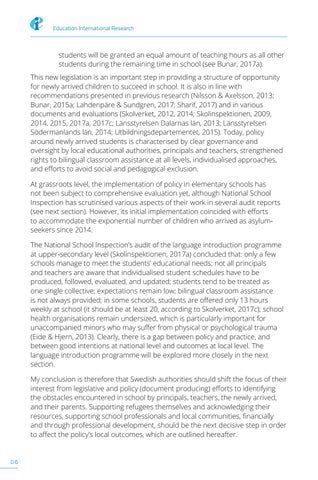 students will be granted an equal amount of teaching hours as all other students during the remaining time in school (see Bunar, 2017a). This new legislation is an important step in providing a structure of opportunity for newly arrived children to succeed in school. It is also in line with recommendations presented in previous research (Nilsson & Axelsson, 2013; Bunar, 2015a; Lahdenpäre & Sundgren, 2017; Sharif, 2017) and in various documents and evaluations (Skolverket, 2012, 2014; Skolinspektionen, 2009, 2014, 2015, 2017a, 2017c; Länsstyrelsen Dalarnas län, 2013; Länsstyrelsen Södermanlands län, 2014; Utbildningsdepartementet, 2015). Today, policy around newly arrived students is characterised by clear governance and oversight by local educational authorities, principals and teachers, strengthened rights to bilingual classroom assistance at all levels, individualised approaches, and efforts to avoid social and pedagogical exclusion. At grassroots level, the implementation of policy in elementary schools has not been subject to comprehensive evaluation yet, although National School Inspection has scrutinised various aspects of their work in several audit reports (see next section). However, its initial implementation coincided with efforts to accommodate the exponential number of children who arrived as asylumseekers since 2014. The National School Inspection’s audit of the language introduction programme at upper-secondary level (Skolinspektionen, 2017a) concluded that: only a few schools manage to meet the students’ educational needs; not all principals and teachers are aware that individualised student schedules have to be produced, followed, evaluated, and updated; students tend to be treated as one single collective; expectations remain low; bilingual classroom assistance is not always provided; in some schools, students are offered only 13 hours weekly at school (it should be at least 20, according to Skolverket, 2017c); school health organisations remain undersized, which is particularly important for unaccompanied minors who may suffer from physical or psychological trauma (Eide & Hjern, 2013). Clearly, there is a gap between policy and practice, and between good intentions at national level and outcomes at local level. The language introduction programme will be explored more closely in the next section. My conclusion is therefore that Swedish authorities should shift the focus of their interest from legislative and policy (document producing) efforts to identifying the obstacles encountered in school by principals, teachers, the newly arrived, and their parents. Supporting refugees themselves and acknowledging their resources, supporting school professionals and local communities, financially and through professional development, should be the next decisive step in order to affect the policy’s local outcomes, which are outlined hereafter.