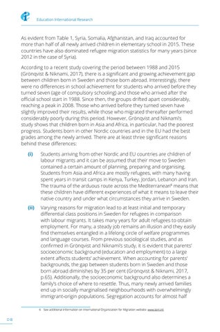 Varying reasons for migration lead to at least initial and temporary differential class positions in Sweden for refugees in comparison with labour migrants. It takes many years for adult refugees to obtain employment. For many, a steady job remains an illusion and they easily find themselves entangled in a lifelong circle of welfare programmes and language courses. From previous sociological studies, and as confirmed in Grönqvist and Niknami’s study, it is evident that parents’ socioeconomic background (education and employment) to a large extent affects students’ achievement. When accounting for parents’ backgrounds, the gap between students born in Sweden and those born abroad diminishes by 35 per cent (Grönqvist & Niknami, 2017, p.65). Additionally, the socioeconomic background also determines a family’s choice of where to resettle. Thus, many newly arrived families end up in socially marginalised neighbourhoods with overwhelmingly immigrant-origin populations. Segregation accounts for almost half 6 See additional information on International Organization for Migration website: www.iom.int
