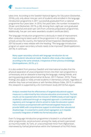 takes time. According to the Swedish National Agency for Education (Skolverket, 2016b, p.6), only about nine per cent of students who enrolled in the language introduction programme in 2011 successfully graduated from a national programme four years later. In 2016, five years later, the number increased to 20 per cent (Skolverket, 2017b, p.28). Among them, eight per cent graduated from vocational and seven per cent from university preparation programmes. Additionally, five per cent were awarded a student certificate (ibid.). The language introduction programme is obviously in need of improvement. After conducting its latest audit of the programme in 42 upper-secondary schools across the country, the National School Inspection (Skolinpektionen, 2017a) issued a news release with the heading: “The language introduction program at upper-secondary schools needs to be improved� (Skolinspektionen, 2017b). It continues: Many upper-secondary schools with language introduction do not meet students’ educational needs. Students often study a few subjects according to the same schedule, irrespective of their previous knowledge. (Skolinspektionen, 2017b. p.1)