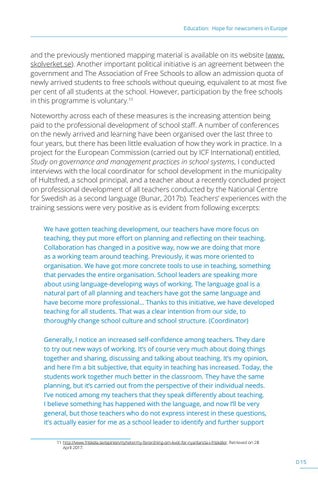 and the previously mentioned mapping material is available on its website (www. skolverket.se). Another important political initiative is an agreement between the government and The Association of Free Schools to allow an admission quota of newly arrived students to free schools without queuing, equivalent to at most five per cent of all students at the school. However, participation by the free schools in this programme is voluntary.11 Noteworthy across each of these measures is the increasing attention being paid to the professional development of school staff. A number of conferences on the newly arrived and learning have been organised over the last three to four years, but there has been little evaluation of how they work in practice. In a project for the European Commission (carried out by ICF International) entitled, Study on governance and management practices in school systems, I conducted interviews with the local coordinator for school development in the municipality of Hultsfred, a school principal, and a teacher about a recently concluded project on professional development of all teachers conducted by the National Centre for Swedish as a second language (Bunar, 2017b). Teachers’ experiences with the training sessions were very positive as is evident from following excerpts: We have gotten teaching development, our teachers have more focus on teaching, they put more effort on planning and reflecting on their teaching. Collaboration has changed in a positive way, now we are doing that more as a working team around teaching. Previously, it was more oriented to organisation. We have got more concrete tools to use in teaching, something that pervades the entire organisation. School leaders are speaking more about using language-developing ways of working. The language goal is a natural part of all planning and teachers have got the same language and have become more professional… Thanks to this initiative, we have developed teaching for all students. That was a clear intention from our side, to thoroughly change school culture and school structure. (Coordinator) Generally, I notice an increased self-confidence among teachers. They dare to try out new ways of working. It’s of course very much about doing things together and sharing, discussing and talking about teaching. It’s my opinion, and here I’m a bit subjective, that equity in teaching has increased. Today, the students work together much better in the classroom. They have the same planning, but it’s carried out from the perspective of their individual needs. I’ve noticed among my teachers that they speak differently about teaching. I believe something has happened with the language, and now I’ll be very general, but those teachers who do not express interest in these questions, it’s actually easier for me as a school leader to identify and further support 11 http://www.friskola.se/opinion/nyheter/ny-forordning-om-kvot-for-nyanlanda-i-friskolor. Retrieved on 28 April 2017.