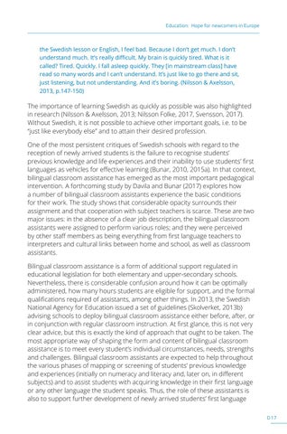 The importance of learning Swedish as quickly as possible was also highlighted in research (Nilsson & Axelsson, 2013; Nilsson Folke, 2017, Svensson, 2017). Without Swedish, it is not possible to achieve other important goals, i.e. to be “just like everybody else” and to attain their desired profession. One of the most persistent critiques of Swedish schools with regard to the reception of newly arrived students is the failure to recognise students’ previous knowledge and life experiences and their inability to use students’ first languages as vehicles for effective learning (Bunar, 2010, 2015a). In that context, bilingual classroom assistance has emerged as the most important pedagogical intervention. A forthcoming study by Davila and Bunar (2017) explores how a number of bilingual classroom assistants experience the basic conditions for their work. The study shows that considerable opacity surrounds their assignment and that cooperation with subject teachers is scarce. These are two major issues: in the absence of a clear job description, the bilingual classroom assistants were assigned to perform various roles; and they were perceived by other staff members as being everything from first language teachers to interpreters and cultural links between home and school, as well as classroom assistants. Bilingual classroom assistance is a form of additional support regulated in educational legislation for both elementary and upper-secondary schools. Nevertheless, there is considerable confusion around how it can be optimally administered, how many hours students are eligible for support, and the formal qualifications required of assistants, among other things. In 2013, the Swedish National Agency for Education issued a set of guidelines (Skolverket, 2013b) advising schools to deploy bilingual classroom assistance either before, after, or in conjunction with regular classroom instruction. At first glance, this is not very clear advice, but this is exactly the kind of approach that ought to be taken. The most appropriate way of shaping the form and content of bilingual classroom assistance is to meet every student’s individual circumstances, needs, strengths and challenges. Bilingual classroom assistants are expected to help throughout the various phases of mapping or screening of students’ previous knowledge and experiences (initially on numeracy and literacy and, later on, in different subjects) and to assist students with acquiring knowledge in their first language or any other language the student speaks. Thus, the role of these assistants is also to support further development of newly arrived students’ first language D 17