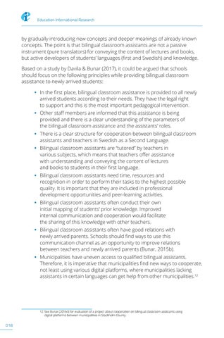 by gradually introducing new concepts and deeper meanings of already known concepts. The point is that bilingual classroom assistants are not a passive instrument (pure translators) for conveying the content of lectures and books, but active developers of students’ languages (first and Swedish) and knowledge. Based on a study by Davila & Bunar (2017), it could be argued that schools should focus on the following principles while providing bilingual classroom assistance to newly arrived students: • In the first place, bilingual classroom assistance is provided to all newly arrived students according to their needs. They have the legal right to support and this is the most important pedagogical intervention. • Other staff members are informed that this assistance is being provided and there is a clear understanding of the parameters of the bilingual classroom assistance and the assistants’ roles. • There is a clear structure for cooperation between bilingual classroom assistants and teachers in Swedish as a Second Language. • Bilingual classroom assistants are “tutored” by teachers in various subjects, which means that teachers offer assistance with understanding and conveying the content of lectures and books to students in their first language. • Bilingual classroom assistants need time, resources and recognition in order to perform their tasks to the highest possible quality. It is important that they are included in professional development opportunities and peer-learning activities. • Bilingual classroom assistants often conduct their own initial mapping of students’ prior knowledge. Improved internal communication and cooperation would facilitate the sharing of this knowledge with other teachers. • Bilingual classroom assistants often have good relations with newly arrived parents. Schools should find ways to use this communication channel as an opportunity to improve relations between teachers and newly arrived parents (Bunar, 2015b). • Municipalities have uneven access to qualified bilingual assistants. Therefore, it is imperative that municipalities find new ways to cooperate, not least using various digital platforms, where municipalities lacking assistants in certain languages can get help from other municipalities.12