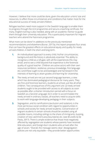 However, I believe that more could be done, given the education unions’ size and resources, to affect those circumstances and conditions that matter most for the educational success of newly arrived children. Refugee teachers need more support in the Swedish language to enable them to progress through the ULV programme and secure a teaching certificate. For many, English training is also needed, along with an academic mentor to guide them through their university education. This is particularly important for migrant teachers who attend the Fast-track programme. What more can be done? In additions to the previously mentioned recommendations and elsewhere (Bunar, 2017a), this report proposes four areas that can have the greatest effects on educational equity and quality for newly arrived children, in both the short and long term. 1.