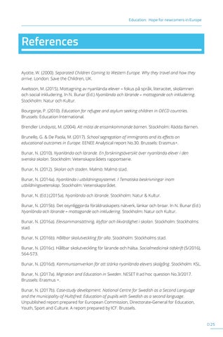 References Ayotte, W. (2000). Separated Children Coming to Western Europe. Why they travel and how they arrive. London: Save the Children, UK. Axelsson, M. (2015). Mottagning av nyanlända elever – fokus på språk, literacitet, skolämnen och social inkludering. In N. Bunar (Ed.) Nyanlända och lärande – mottagande och inkludering. Stockholm: Natur och Kultur. Bourgonje, P. (2010). Education for refugee and asylum seeking children in OECD countries. Brussels: Education International. Brendler Lindqvist, M. (2004). Att möta de ensamkommande barnen. Stockholm: Rädda Barnen. Brunello, G. & De Paola, M. (2017). School segregation of immigrants and its effects on educational outcomes in Europe. EENEE Analytical report No.30. Brussels: Erasmus+. Bunar, N. (2010). Nyanlända och lärande. En forskningsöversikt över nyanlända elever i den svenska skolan. Stockholm: Vetenskapsrådets rapportserie. Bunar, N. (2012). Skolan och staden. Malmö: Malmö stad. Bunar, N. (2014a). Nyanlända i utbildningssystemet. I Tematiska beskrivningar inom utbildningsvetenskap. Stockholm: Vetenskapsrådet. Bunar, N. (Ed.) (2015a). Nyanlända och lärande. Stockholm: Natur & Kultur. Bunar, N. (2015b). Det osynliggjorda föräldraskapets nätverk, länkar och broar. In N. Bunar (Ed.) Nyanlända och lärande – mottagande och inkludering. Stockholm: Natur och Kultur. Bunar, N. (2016a). Elevsammansättning, klyftor och likvärdighet i skolan. Stockholm: Stockholms stad. Bunar, N. (2016b). Hållbar skolutveckling för alla. Stockholm: Stockholms stad. Bunar, N. (2016c). Hållbar skolutveckling för lärande och hälsa. Socialmedicinsk tidskrift (5/2016), 564-573. Bunar, N. (2016d). Kommunsamverkan för att stärka nyanlända elevers skolgång. Stockholm: KSL. Bunar, N. (2017a). Migration and Education in Sweden. NESET II ad hoc question No.3/2017. Brussels: Erasmus +. Bunar, N. (2017b). Case-study development. National Centre for Swedish as a Second Language and the municipality of Hultsfred: Education of pupils with Swedish as a second language. Unpublished report prepared for European Commission, Directorate-General for Education, Youth, Sport and Culture. A report prepared by ICF. Brussels.