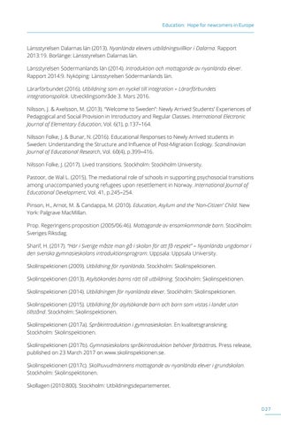 Länsstyrelsen Dalarnas län (2013). Nyanlända elevers utbildningsvillkor i Dalarna. Rapport 2013:19. Borlänge: Länsstyrelsen Dalarnas län. Länsstyrelsen Södermanlands län (2014). Introduktion och mottagande av nyanlända elever. Rapport 2014:9. Nyköping: Länsstyrelsen Södermanlands län. Lärarförbundet (2016). Utbildning som en nyckel till integration – Lärarförbundets integrationspolitik. Utvecklingsområde 3. Mars 2016. Nilsson, J. & Axelsson, M. (2013). “Welcome to Sweden”: Newly Arrived Students’ Experiences of Pedagogical and Social Provision in Introductory and Regular Classes. International Electronic Journal of Elementary Education, Vol. 6(1), p.137–164. Nilsson Folke, J. & Bunar, N. (2016). Educational Responses to Newly Arrived students in Sweden: Understanding the Structure and Influence of Post-Migration Ecology. Scandinavian Journal of Educational Research, Vol. 60(4), p.399–416. Nilsson Folke, J. (2017). Lived transitions. Stockholm: Stockholm University. Pastoor, de Wal L. (2015). The mediational role of schools in supporting psychosocial transitions among unaccompanied young refugees upon resettlement in Norway. International Journal of Educational Development, Vol. 41, p.245–254. Pinson, H., Arnot, M. & Candappa, M. (2010). Education, Asylum and the ‘Non-Citizen’ Child. New York: Palgrave MacMillan. Prop. Regeringens proposition (2005/06:46). Mottagande av ensamkommande barn. Stockholm: Sveriges Riksdag. Sharif, H. (2017). “Här i Sverige måste man gå i skolan för att få respekt” – Nyanlända ungdomar i den svenska gymnasieskolans introduktionsprogram. Uppsala: Uppsala University. Skolinspektionen (2009). Utbildning för nyanlända. Stockholm: Skolinspektionen. Skolinspektionen (2013). Asylsökandes barns rätt till utbildning. Stockholm: Skolinspektionen. Skolinspektionen (2014). Utbildningen för nyanlända elever. Stockholm: Skolinspektionen. Skolinspektionen (2015). Utbildning för asylsökande barn och barn som vistas i landet utan tillstånd. Stockholm: Skolinspektionen. Skolinspektionen (2017a). Språkintroduktion i gymnasieskolan. En kvalitetsgranskning. Stockholm: Skolinspektionen. Skolinspektionen (2017b). Gymnasieskolans språkintroduktion behöver förbättras. Press release, published on 23 March 2017 on www.skolinspektionen.se. Skolinspektionen (2017c). Skolhuvudmännens mottagande av nyanlända elever i grundskolan. Stockholm: Skolinspektitonen. Skollagen (2010:800). Stockholm: Utbildningsdepartementet.