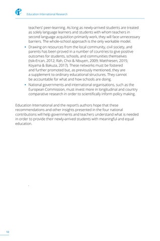 teachers’ peer-learning. As long as newly-arrived students are treated as solely language learners and students with whom teachers in second language acquisition primarily work, they will face unnecessary barriers. The whole-school approach is the only workable model. • Drawing on resources from the local community, civil society, and parents has been proved in a number of countries to give positive outcomes for students, schools, and communities themselves (Isik-Ercan, 2012; Rah, Choi & Nbuyen, 2009; Matthiesen, 2015; Koyama & Bakuza, 2017). These networks must be fostered and further promoted but, as previously mentioned, they are a supplement to ordinary educational structures. They cannot be accountable for what and how schools are doing. • National governments and international organisations, such as the European Commission, must invest more in longitudinal and country comparative research in order to scientifically inform policy making. Education International and the report’s authors hope that these recommendations and other insights presented in the four national contributions will help governments and teachers understand what is needed in order to provide their newly-arrived students with meaningful and equal education.