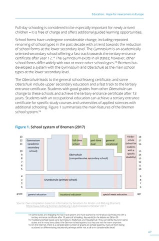 Source: Own compilation based on information by Senatorin fĂźr Kinder und Bildung (Bremen): https://www.bildung.bremen.de/bildung-1464 Accessed 6 October 2017. 14 Some states are dropping the fast track system and have started to re-introduce Gymnasiums with a tertiary entrance certificate after 13 years of schooling. Key words for the debate are G8 or G9. 15 Traditional school types were Gymnasium, Realschule, and Hauptschule. They can still be found in some states and in many texts about the German school system, but they are not the norm anymore. 16 On the Internet, there is a considerable number of graphs on school systems, many of them being outdated or differentiating vocational pathways either not at all or in considerable detail.
