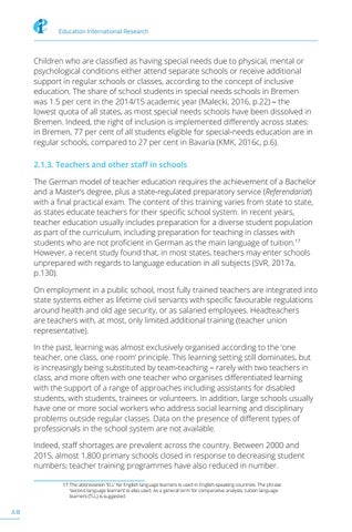 Children who are classified as having special needs due to physical, mental or psychological conditions either attend separate schools or receive additional support in regular schools or classes, according to the concept of inclusive education. The share of school students in special needs schools in Bremen was 1.5 per cent in the 2014/15 academic year (Malecki, 2016, p.22) – the lowest quota of all states, as most special needs schools have been dissolved in Bremen. Indeed, the right of inclusion is implemented differently across states: in Bremen, 77 per cent of all students eligible for special-needs education are in regular schools, compared to 27 per cent in Bavaria (KMK, 2016c, p.6). 2.1.3. Teachers and other staff in schools The German model of teacher education requires the achievement of a Bachelor and a Master’s degree, plus a state-regulated preparatory service (Referendariat) with a final practical exam. The content of this training varies from state to state, as states educate teachers for their specific school system. In recent years, teacher education usually includes preparation for a diverse student population as part of the curriculum, including preparation for teaching in classes with students who are not proficient in German as the main language of tuition.17 However, a recent study found that, in most states, teachers may enter schools unprepared with regards to language education in all subjects (SVR, 2017a, p.130). On employment in a public school, most fully trained teachers are integrated into state systems either as lifetime civil servants with specific favourable regulations around health and old age security, or as salaried employees. Headteachers are teachers with, at most, only limited additional training (teacher union representative). In the past, learning was almost exclusively organised according to the ‘one teacher, one class, one room’ principle. This learning setting still dominates, but is increasingly being substituted by team-teaching – rarely with two teachers in class, and more often with one teacher who organises differentiated learning with the support of a range of approaches including assistants for disabled students, with students, trainees or volunteers. In addition, large schools usually have one or more social workers who address social learning and disciplinary problems outside regular classes. Data on the presence of different types of professionals in the school system are not available. Indeed, staff shortages are prevalent across the country. Between 2000 and 2015, almost 1,800 primary schools closed in response to decreasing student numbers; teacher training programmes have also reduced in number. 17 The abbreviation ‘ELL’ for English language learners is used in English-speaking countries. The phrase ‘second language learners’ is also used. As a general term for comparative analysis, tuition language learners (TLL) is suggested.