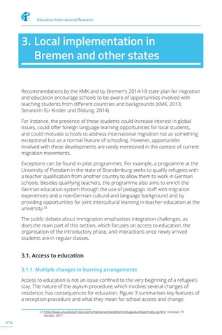 3. Local implementation in Bremen and other states Recommendations by the KMK and by Bremen’s 2014-18 state plan for migration and education encourage schools to be aware of opportunities involved with teaching students from different countries and backgrounds (KMK, 2013; Senatorin für Kinder und Bildung, 2014). For instance, the presence of these students could increase interest in global issues, could offer foreign language learning opportunities for local students, and could motivate schools to address international migration not as something exceptional but as a normal feature of schooling. However, opportunities involved with these developments are rarely mentioned in the context of current migration movements. Exceptions can be found in pilot programmes. For example, a programme at the University of Potsdam in the state of Brandenburg seeks to qualify refugees with a teacher qualification from another country to allow them to work in German schools. Besides qualifying teachers, the programme also aims to enrich the German education system through the use of pedagogic staff with migration experiences and a non-German cultural and language background and by providing opportunities for joint intercultural learning in teacher education at the university.23 The public debate about immigration emphasises integration challenges, as does the main part of this section, which focuses on access to education, the organisation of the introductory phase, and interactions once newly arrived students are in regular classes.