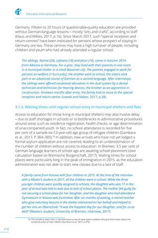 Germany. Fifteen to 20 hours of questionable-quality education are provided without German-language lessons – mostly “arts and crafts”, according to staff (Klaus and Millies, 2017, p.16). Since March 2017, such “special reception and return centres” have been instituted for persons whose prospect of staying in Germany are low. These centres may have a high turnover of people, including children and youth who had already attended a regular school. The siblings, Naime (20), Lejhana (18) and Jeton (16), came in Autumn 2014 from Albania to Germany. For a year, they lived with their parents in one room in a municipal shelter in a small Bavarian city. The parents engaged in work for persons on welfare (1-Euro-jobs), the brother went to school, the sisters took part in an advanced course of German as a second language. After internships, the siblings were offered vocational education in the dual system by a dental technician and technician for hearing devices, the brother as an apprentice in construction. Nineteen months after entry, the family had to move to the special reception and return centre. (Lewek and Naber, 2017, p.28)
