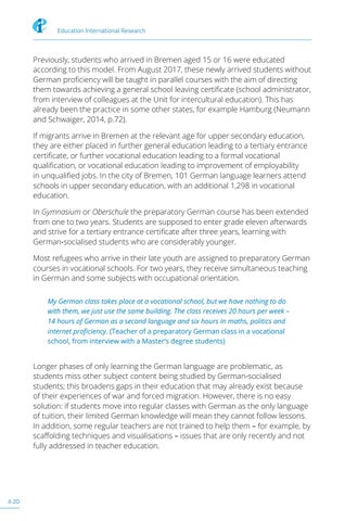 Previously, students who arrived in Bremen aged 15 or 16 were educated according to this model. From August 2017, these newly arrived students without German proficiency will be taught in parallel courses with the aim of directing them towards achieving a general school leaving certificate (school administrator, from interview of colleagues at the Unit for intercultural education). This has already been the practice in some other states, for example Hamburg (Neumann and Schwaiger, 2014, p.72). If migrants arrive in Bremen at the relevant age for upper secondary education, they are either placed in further general education leading to a tertiary entrance certificate, or further vocational education leading to a formal vocational qualification, or vocational education leading to improvement of employability in unqualified jobs. In the city of Bremen, 101 German language learners attend schools in upper secondary education, with an additional 1,298 in vocational education. In Gymnasium or Oberschule the preparatory German course has been extended from one to two years. Students are supposed to enter grade eleven afterwards and strive for a tertiary entrance certificate after three years, learning with German-socialised students who are considerably younger. Most refugees who arrive in their late youth are assigned to preparatory German courses in vocational schools. For two years, they receive simultaneous teaching in German and some subjects with occupational orientation. My German class takes place at a vocational school, but we have nothing to do with them, we just use the same building. The class receives 20 hours per week – 14 hours of German as a second language and six hours in maths, politics and internet proficiency. (Teacher of a preparatory German class in a vocational school, from interview with a Master’s degree students)