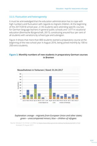 3.2.3. Fluctuation and heterogeneity It must be acknowledged that the education administration has to cope with high numbers and fluctuation with regards to migrant children. At the beginning of the 2017/2018 school year, 2,145 students were attending specific courses for German language learners in general public schools and 1,477 in vocational education (Bremische Bürgerschaft, 2017), constituting around four per cent of all students with variations by school type and subregion. Figure 4 shows that more than 800 students started a preparatory course at the beginning of the new school year in August 2016, being joined monthly by 100 to 200 extra students.