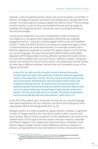 In the 2017/18 academic year, 55 teachers for German as a second language have been employed by the city of Bremen and 78 are still employed by other organisations (Bremische Bürgerschaft 2017, p.10). Refugee teachers are rarely accepted as regular teachers. However, a significant number of refugee teachers, who have been trained in other countries and have not been able to achieve recognition of their qualification, also work for the Stadtteil-Schule. As the regular German teacher education requires a Bachelor and Master’s degree in two subjects plus state training on completion of the Master’s degree, foreign teachers study additional courses at university to achieve a comparable level to German teachers in terms of level and content. 28 See for example union demands on the occasion of state elections: https://www.gew-hb.de/aktuelles/ detailseite/neuigkeiten/buergerschaftswahl-2011/ Accessed 20 October 2017. 29 http://www.stadtteilschule-bremen.de/index.php/bildung/deutsch-als-zweitsprache Accessed 20 October 2017.