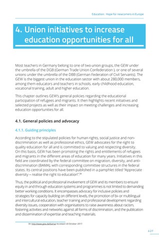 4.1.1. Guiding principles According to the stipulated policies for human rights, social justice and nondiscrimination as well as professional ethics, GEW advocates for the right to quality education for all and is committed to valuing and respecting diversity. On this basis, GEW has been promoting the rights and entitlements of refugees and migrants in the different areas of education for many years. Initiatives in this field are coordinated by the federal committee on migration, diversity, and antidiscrimination (BAMA), with corresponding committee structures in the federal states. Its central positions have been published in a pamphlet titled “Appreciate diversity – realise the right to education”.34 Thus, the political and professional involvement of GEW and its members to ensure equity in and through education systems and programmes is not limited to demanding better working conditions. It encompasses advocacy for inclusive policies and strategies for capacity building on different levels, the promotion of bi- or multilingual and intercultural education, teacher training and professional development regarding diversity issues, cooperation with organisations to raise awareness about racism, fostering activities and networks against all forms of discrimination, and the publication and dissemination of expertise and teaching materials. 34 http://www.gew.de/bama/ Accessed 20 October 2017.