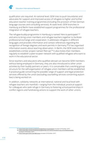 qualification are required. At national level, GEW tries to push boundaries and advocates for support and improved access of refugees to higher and further education teacher training programmes (including the provision of free German language courses and consulting services). At state level, GEW branches in Hamburg and Berlin have established support programmes for the professional integration of refugee teachers. The refugee-buddy-programme in Hamburg is named ‘Here to participate!’ 47 and aims to bring union members and refugee teachers together to facilitate professional exchange and cooperation. It addresses refugees in different languages and provides information and contact references regarding the recognition of foreign degrees and work permits in Germany.48 It has organised information events about teaching observation. In Berlin, the GEW state branch established a similar project named ‘Peer-Up’.49 It also invites their members regularly to establish a peer-to-peer network with qualified refugees who want to work in the educational sector. Since teachers and educators who qualified abroad can become GEW members without being employed in Germany, they are also introduced to other union activities by their buddy partners or peers. It is conceivable that a working group structure for the self-organisation of refugee union members will be established. A practical guide concerning the possible range of support and legal protection services offered by the union (excluding counselling services concerning asylum law) is being worked on. In addition, solidarity networks at international, national and local level with refugee teachers are manifold – ranging from the individual, practical support for colleagues who seek refuge in Germany to fostering school-partnerships in conflict regions and fundraising actions to support the work of other unions.