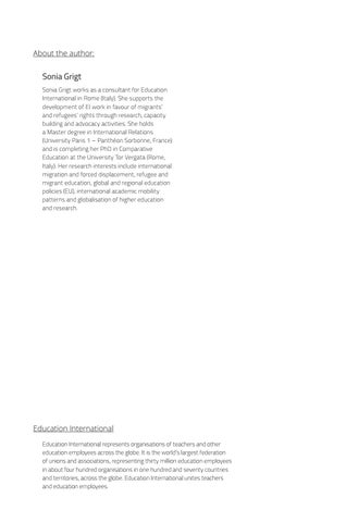 Sonia Grigt Sonia Grigt works as a consultant for Education International in Rome (Italy). She supports the development of EI work in favour of migrants’ and refugees’ rights through research, capacity building and advocacy activities. She holds a Master degree in International Relations (University Paris 1 – Panthéon Sorbonne, France) and is completing her PhD in Comparative Education at the University Tor Vergata (Rome, Italy). Her research interests include international migration and forced displacement, refugee and migrant education, global and regional education policies (EU), international academic mobility patterns and globalisation of higher education and research.