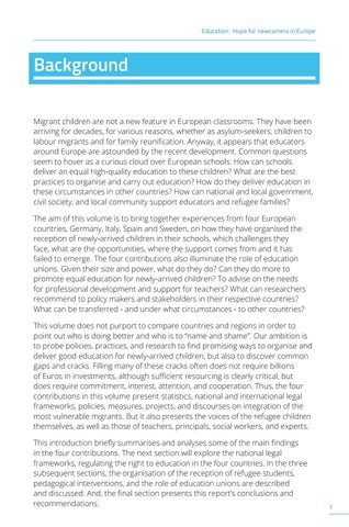Background Migrant children are not a new feature in European classrooms. They have been arriving for decades, for various reasons, whether as asylum-seekers, children to labour migrants and for family reunification. Anyway, it appears that educators around Europe are astounded by the recent development. Common questions seem to hover as a curious cloud over European schools: How can schools deliver an equal high-quality education to these children? What are the best practices to organise and carry out education? How do they deliver education in these circumstances in other countries? How can national and local government, civil society, and local community support educators and refugee families? The aim of this volume is to bring together experiences from four European countries, Germany, Italy, Spain and Sweden, on how they have organised the reception of newly-arrived children in their schools, which challenges they face, what are the opportunities, where the support comes from and it has failed to emerge. The four contributions also illuminate the role of education unions. Given their size and power, what do they do? Can they do more to promote equal education for newly-arrived children? To advise on the needs for professional development and support for teachers? What can researchers recommend to policy makers and stakeholders in their respective countries? What can be transferred - and under what circumstances - to other countries? This volume does not purport to compare countries and regions in order to point out who is doing better and who is to “name and shame�. Our ambition is to probe policies, practices, and research to find promising ways to organise and deliver good education for newly-arrived children, but also to discover common gaps and cracks. Filling many of these cracks often does not require billions of Euros in investments, although sufficient resourcing is clearly critical, but does require commitment, interest, attention, and cooperation. Thus, the four contributions in this volume present statistics, national and international legal frameworks, policies, measures, projects, and discourses on integration of the most vulnerable migrants. But it also presents the voices of the refugee children themselves, as well as those of teachers, principals, social workers, and experts. This introduction briefly summarises and analyses some of the main findings in the four contributions. The next section will explore the national legal frameworks, regulating the right to education in the four countries. In the three subsequent sections, the organisation of the reception of refugee students, pedagogical interventions, and the role of education unions are described and discussed. And, the final section presents this report’s conclusions and recommendations.