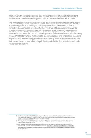 interviews with school personnel as a frequent source of anxiety for resident families when newly arrived migrant children are enrolled in their schools. The immigration “crisis” is also perceived as another demonstration of “Europe” abandoning Italy8 and lacking in solidarity towards a phenomenon that is considered continental, breeding further mistrust of Italian citizens towards European Union (EU) institutions. In November 2016, Amnesty International released a controversial report9 revealing cases of abuse and torture in the newly created “hotpots” (whose mission is to identify, register and fingerprint incoming migrants) and incriminating EU leaders for “driving the Italian authorities to the limits – and beyond – of what is legal” (Matteo de Bellis, Amnesty International’s researcher on Italy)10.