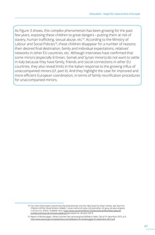 14 For more information concerning this phenomenon and the risks faced by these minors, see Save the Children (2016), Piccoli Schiavi invisibili. I minori vittime di tratta e sfruttamento: chi sono, da dove vengono e chi lucra su di loro. Available here: https://www.savethechildren.it/sites/default/files/files/uploads/ pubblicazioni/piccoli-schiaviinvisibili.pdf (Accessed on 28 April 2017) 15 Report di Monitoraggio. I Minori Stranieri Non Accompagnati (MSNA) in Italia. Dati al 31 dicembre 2015, p.3: http://www.lavoro.gov.it/notizie/Documents/Report-di-monitoraggio-31-diciembre-2015.pdf