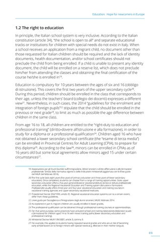 1.2 The right to education In principle, the Italian school system is very inclusive. According to the Italian constitution (article 34), “the school is open to all” and separate educational tracks or institutions for children with special needs do not exist in Italy. When a school receives an application from a migrant child, no document other than those requested for Italian children should be required and the lack of identity documents, health documentation, and/or school certificates should not preclude the child from being enrolled. If a child is unable to present any identity document, the child will be enrolled on a reserve list, which does not preclude him/her from attending the classes and obtaining the final certification of the course he/she is enrolled in19. Education is compulsory for 10 years between the ages of six and 16 (obbligo di istruzione). This covers the first two years of the upper secondary cycle20. During this period, children should be enrolled in the class that corresponds to their age, unless the teachers’ board (collegio dei docenti) expresses a different view21. Nevertheless, in such cases, the 2014 “guidelines for the enrolment and integration of foreign pupils”22 stipulate that the child should be enrolled in the previous or next grade23, to limit as much as possible the age difference between children in the same class. From age 16 to 18, all children are entitled to the “right-duty to education and professional training” (diritto-dovere all’istruzione e alla formazione), in order to study for a diploma or a professional qualification24. Children aged 16 who have not obtained a lower secondary school certificate (the “esame di terza media”) can be enrolled in Provincial Centres for Adult Learning (CPIA), to prepare for this diploma25. According to the law26, minors can be enrolled in CPIAs as of 16 years old but some local agreements allow minors aged 15 under certain circumstances27. 19 Associazione per gli Studi Giuridici sull’Immigrazione, Minori stranieri e diritto all’istruzione e alla formazione professionale. Sintesi della normativa vigente e delle indicazioni ministeriali (aggiornata con le linee guide del MIUR del febbraio 2014). 20 The first cycle lasts eight years (five years of primary education and three years of lower secondary education). Once completed, students can choose from a range of training opportunities. State upper secondary education offers a five-year general (liceo) or vocational (istituto tecnico or istituto professionale) education, while the Regional Vocational Education and Training system (Istruzione e Formazione Professionale) usually offers three-year and four-year vocational education and training courses in vocational training agencies and upper secondary vocational institutes. 21 Presidential Decree 394/1999, article 45. Regional vocational education systems can to a certain extent, differ from these guidelines. 22 Linee guida per l’accoglienza e l’integrazione degli alunni stranieri, MIUR, febbraio 2014. 23 As explained in part II, migrant children are usually enrolled in lower grades. 24 The professional qualification can be obtained through professional training courses or apprenticeships. 25 For that same purpose, some provinces have activated school and training laboratories (laboratori scuola e formazione) for children aged 14 to 16 with mixed training paths (lower secondary education and professional training). 26 Ministerial Decree MIUR 139/2007, article 3, comma 3. 27 For example, this applies to students having repeated several grades and who are at risk of becoming early school leavers or to foreign minors with special needs (e.g. illiterate in their mother tongue).