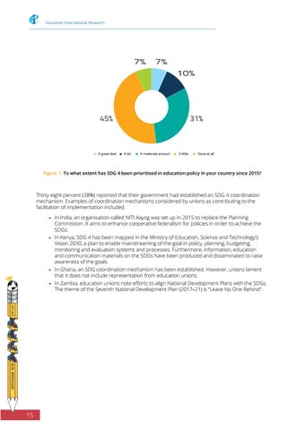 Thirty eight percent (38%) reported that their government had established an SDG 4 coordination mechanism. Examples of coordination mechanisms considered by unions as contributing to the facilitation of implementation included: -- In India, an organisation called NITI Aayog was set up in 2015 to replace the Planning Commission. It aims to enhance cooperative federalism for policies in order to achieve the SDGs. -- In Kenya, SDG 4 has been mapped in the Ministry of Education, Science and Technology’s Vision 2030, a plan to enable mainstreaming of the goal in policy, planning, budgeting, monitoring and evaluation systems and processes. Furthermore, information, education and communication materials on the SDGs have been produced and disseminated to raise awareness of the goals. -- In Ghana, an SDG coordination mechanism has been established. However, unions lament that it does not include representation from education unions. -- In Zambia, education unions note efforts to align National Development Plans with the SDGs. The theme of the Seventh National Development Plan (2017–21) is “Leave No One Behind”. GRO.EI-IE 0302 NOITA CUDE