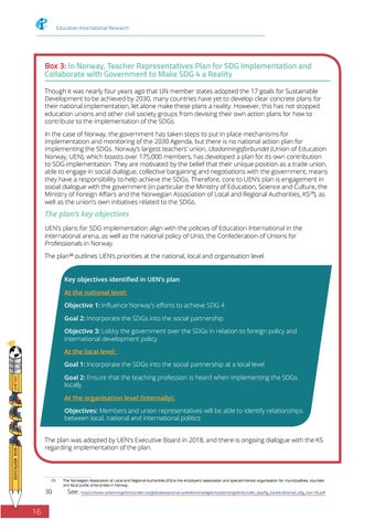 Box 3: In Norway, Teacher Representatives Plan for SDG Implementation and Collaborate with Government to Make SDG 4 a Reality Though it was nearly four years ago that UN member states adopted the 17 goals for Sustainable Development to be achieved by 2030, many countries have yet to develop clear concrete plans for their national implementation, let alone make these plans a reality. However, this has not stopped education unions and other civil society groups from devising their own action plans for how to contribute to the implementation of the SDGs. In the case of Norway, the government has taken steps to put in place mechanisms for implementation and monitoring of the 2030 Agenda, but there is no national action plan for implementing the SDGs. Norway’s largest teachers’ union, Utadanningsforbundet (Union of Education Norway, UEN), which boasts over 175,000 members, has developed a plan for its own contribution to SDG implementation. They are motivated by the belief that their unique position as a trade union, able to engage in social dialogue, collective bargaining and negotiations with the government, means they have a responsibility to help achieve the SDGs. Therefore, core to UEN’s plan is engagement in social dialogue with the government (in particular the Ministry of Education, Science and Culture, the Ministry of Foreign Affairs and the Norwegian Association of Local and Regional Authorities, KS29), as well as the union’s own initiatives related to the SDGs.