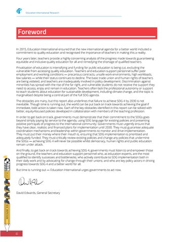 Foreword In 2015, Education International ensured that the new international agenda for a better world included a commitment to quality education and recognised the importance of teachers in making this a reality. Four years later, teachers provide a highly concerning analysis of the progress made towards guaranteeing equitable and inclusive quality education for all and remedying the shortage of qualified teachers. Privatisation of education is intensifying and funding for public education is being cut, excluding the vulnerable from accessing quality education. Teachers and education support personnel suffer poor employment and working conditions — precarious contracts, unsafe work environments, high workloads, low salaries — while their status continues to decline. The basic trade union and human rights of teachers are being violated, and teachers are inadequately involved in policy development. Discrimination against minorities has spread with the rise of the far right, and vulnerable students do not receive the support they need to access, enjoy and remain in education. Teachers often lack the professional autonomy or support to teach students about education for sustainable development, including climate change, and the topic is marginalised despite being a central part of the full SDG agenda. The obstacles are many, but this report also underlines that failure to achieve SDG 4 by 2030 is not inevitable. Though time is running out, the world can be put back on track towards achieving the goal if immediate, bold action is taken now. Each of the key obstacles identified in this report can be solved with better, equity-focused policies developed in collaboration with members of the teaching profession. In order to get back on track, governments must demonstrate that their commitment to the SDGs goes beyond simply paying lip service to the agenda, using SDG language for existing policies and presenting positive portrayals of progress to the international community. Governments must urgently ensure that they have clear, realistic and financed plans for implementation until 2030. They must guarantee adequate coordination mechanisms and leadership within governments to monitor and drive implementation. They must put their money where their mouth is, ensuring that SDG implementation is prioritised and adequately funded. They must critically review existing policies and change any policies that undermine the SDGs — achieving SDG 4 will never be possible whilst democracy, human rights and public education remain under attack. And finally, to get back on track towards achieving SDG 4, governments must listen to and empower those on the ground, the teachers and education support personnel who, as education experts, are the most qualified to identify successes and bottlenecks; who actively contribute to SDG implementation both in their daily work and by advocating for change through their unions; and who are key policy actors in driving progress towards SDG 4 and a better world for all. GRO.EI-IE