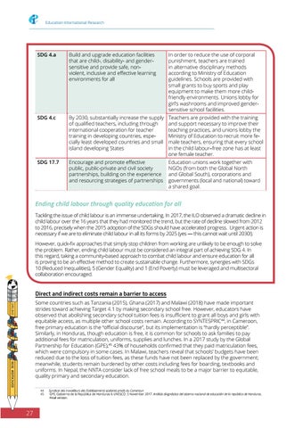 Some countries such as Tanzania (2015), Ghana (2017) and Malawi (2018) have made important strides toward achieving Target 4.1 by making secondary school free. However, educators have observed that abolishing secondary school tuition fees is insufficient to grant all boys and girls with equitable access, as multiple other school costs remain. According to SYNTESPRIC44, in Cameroon, free primary education is the “official discourse”, but its implementation is “hardly perceptible”. Similarly, in Honduras, though education is free, it is common for schools to ask families to pay additional fees for matriculation, uniforms, supplies and lunches. In a 2017 study by the Global Partnership for Education (GPE),45 43% of households confirmed that they paid matriculation fees, which were compulsory in some cases. In Malawi, teachers reveal that schools’ budgets have been reduced due to the loss of tuition fees, as these funds have not been replaced by the government; meanwhile, students remain burdened by other costs including fees for boarding, textbooks and uniforms. In Nepal, the NNTA consider lack of free school meals to be a major barrier to equitable, quality primary and secondary education.