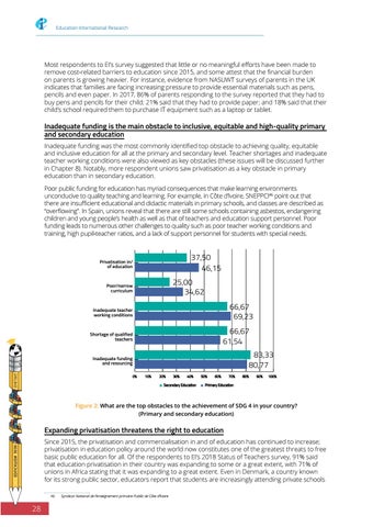 Inadequate funding is the main obstacle to inclusive, equitable and high-quality primary and secondary education Inadequate funding was the most commonly identified top obstacle to achieving quality, equitable and inclusive education for all at the primary and secondary level. Teacher shortages and inadequate teacher working conditions were also viewed as key obstacles (these issues will be discussed further in Chapter 8). Notably, more respondent unions saw privatisation as a key obstacle in primary education than in secondary education. Poor public funding for education has myriad consequences that make learning environments unconducive to quality teaching and learning. For example, in Côte d’Ivoire, SNEPPCI46 point out that there are insufficient educational and didactic materials in primary schools, and classes are described as “overflowing”. In Spain, unions reveal that there are still some schools containing asbestos, endangering children and young people’s health as well as that of teachers and education support personnel. Poor funding leads to numerous other challenges to quality such as poor teacher working conditions and training, high pupil-teacher ratios, and a lack of support personnel for students with special needs.