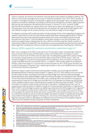 Abroad, DFID’s support for education privatization undermines target 4.1 Both unions recognise that DFID is a key donor for the education sector internationally. However, they are concerned by some of DFID’s policy choices. According to NEU, the SDGs are used in rhetoric to frame much of DFID’s work, but they have not adequately guided DFID’s policy strategy. For example, though teachers are one of DFID’s policy areas of focus, DFID’s policy 62 does not include strategies to increase the attractiveness of the profession, which are vital to increase the supply of qualified teachers and achieve SGD 4.c. In addition, DFID’s policy related to privatisation directly undermines target 4.1’s commitment to free education for all — DFID argues that low cost private schools play an important role in delivering education in low- and middle-income countries and that they should be supported.63