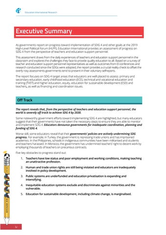Executive Summary As governments report on progress toward implementation of SDG 4 and other goals at the 2019 High-Level Political Forum (HLPF), Education International provides an assessment of progress on SDG 4 from the perspective of teachers and education support personnel. This assessment draws from the daily experiences of teachers and education support personnel in the classroom and explores the challenges they face to provide quality education to all. Based on a survey of teacher and education support personnel representatives as well as outcomes from EI conferences and research conducted since the SDGs were adopted, the report provides a crucial reality check to offset the overly rosy assessments governments tend to present in their voluntary selfreports. The report focuses on SDG 4 target areas that educators are well placed to assess: primary and secondary education, early childhood education (ECE), technical and vocational education and training (TVET) and higher education, equity, education for sustainable development (ESD) and teachers, as well as financing and coordination issues.