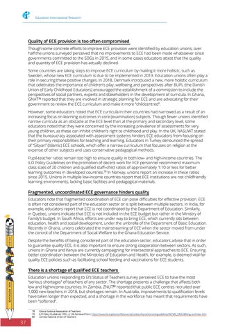 Quality of ECE provision is too often compromised Though some concrete efforts to improve ECE provision were identified by education unions, over half the unions surveyed perceived that no improvements to ECE had been made whatsoever since governments committed to the SDGs in 2015, and in some cases educators attest that the quality and quantity of ECE provision has actually declined. Some countries are taking steps to improve ECE curriculum by making it more holistic, such as Sweden, whose new ECE curriculum is due to be implemented in 2019. Education unions often play a role in securing these positive changes. In 2018, Denmark introduced a new, more holistic curriculum that celebrates the importance of children’s play, wellbeing and perspectives after BUPL (the Danish Union of Early Childhood Educators) encouraged the establishment of a commission to include the perspectives of social partners, experts and stakeholders in the development of curricula. In Ghana, GNAT78 reported that they are involved in strategic planning for ECE and are advocating for their government to review the ECE curriculum and make it more “childcentred”. However, some educators noted that ECE curricula in their countries had narrowed as a result of an increasing focus on learning outcomes in core (examination) subjects. Though fewer unions identified narrow curricula as an obstacle at the ECE level than at the primary and secondary level, some educators noted that they were concerned by the increasing prevalence of assessments for very young children, as these can inhibit children’s right to childhood and play. In the UK, NASUWT stated that the bureaucracy associated with assessment systems hinders ECE educators from focusing on their primary responsibilities for teaching and learning. Educators in Turkey denounced the spread of “Sibyan” (Islamic) ECE schools, which offer a narrow curriculum that focuses on religion at the expense of other subjects and uses conservative pedagogical methods. Pupil-teacher ratios remain too high to ensure quality in both low- and high-income countries. The ILO Policy Guidelines on the promotion of decent work for ECE personnel recommend maximum class sizes of 20 children and qualified staff–child ratios of approximately 1:10 or less for better learning outcomes in developed countries.79 In Norway, unions report an increase in these ratios since 2015. Unions in multiple low-income countries report that ECE institutions are not childfriendly learning environments, lacking basic facilities and pedagogical materials.