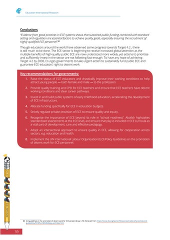 Key recommendations for governments: 1. Raise the status of ECE educators and drastically improve their working conditions to help attract young people — both female and male — to the profession. 2. Provide quality training and CPD for ECE teachers and ensure that ECE teachers have decent working conditions and clear career pathways. 3. Invest in and build public systems of early childhood education, accelerating the development of ECE infrastructure. 4. Allocate funding specifically for ECE in education budgets. 5. Strictly regulate private provision of ECE to ensure quality and equity. 6. Recognise the importance of ECE beyond its role in “school readiness”. Abolish highstakes standardised assessments at the ECE level, and ensure that play is included in ECE curricula as a vital part of development, care and effective pedagogy. 7. Adopt an intersectoral approach to ensure quality in ECE, allowing for cooperation across sectors, e.g. education and health. 8. Implement the UN International Labour Organisation (ILO) Policy Guidelines on the promotion of decent work for ECE personnel.