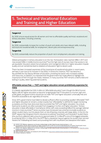 5. T echnical and Vocational Education and Training and Higher Education Target 4.3 By 2030, ensure equal access for all women and men to affordable quality technical, vocational and tertiary education, including university Target 4.4 By 2030, substantially increase the number of youth and adults who have relevant skills, including technical and vocational skills, for employment, decent jobs and entrepreneurship Target 8.6: By 2020, substantially reduce the proportion of youth not in employment, education or training Global participation in tertiary education is on the rise. Participation rates reached 38% in 2017 and now exceed 50% in middle-income countries,84 but the high cost of courses mean that access is not yet equitable. Educators attest that privatisation and managerial reforms in higher education impede quality and can sometimes lead to violations of educators’ right to decent work. There has been increased awareness of the importance of vocational education in recent years, perhaps in part due to its inclusion in the SDGs. In Ghana for instance, TVET has become a key portfolio for the Deputy Minister of Education, providing the sector with increased visibility and resources. In Pakistan, it is reported that the government has made efforts to highlight the importance of TVET through the media. However, in many countries TVET remains underfunded and lacking in quality, deterring potential students.