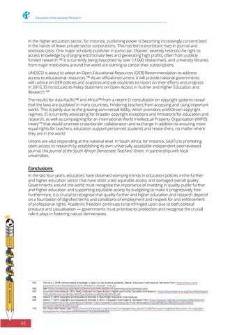 Tennant, J. 2018. Democratising Knowledge: a report on the scholarly publisher, Elsevier. Education International. Retrieved from: https://issuu.com/ educationinternational/docs/2018_eiresearch_elsevier_final_en See: https://unesco.ijs.si/project/unesco-recommendation-on-open-educational-resources/ Education International. 2016. Policy Statement on Open Access in Higher and Further Education and Research: https://download.ei-ie.org/Docs/WebDepot/ Policy%20Statement%20on%20Open%20Access%20in%20FHER.pdf Nobre, T. 2019. Copyright and Educational Activities in Asia-Pacific. Education International. Nobre, T. 2019. Copyright and Educational Activities in Africa. Education International. Retrieved from: https://spaces.hightail.com/space/B8sx4keGxH/ files/fi-69d077a2-b33c-4d0c-8fc9-a1d5660f11e8/fv-434c847f-0a36-44ad-9b77-0e180fac8840/Copyright%20and%20Educational%20 Exceptions%20in%20Africa.pdf For more information, see: https://worldsofeducation.org/en/woe_homepage/woe_detail/16238/“let’s-spark-a-global-discussion-on-copyrightexceptions-for-education-and-research”-by-david-edward
