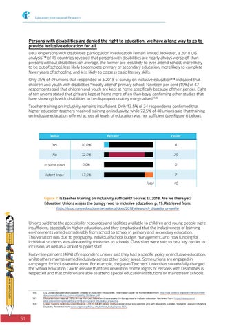 Figure 7: Is teacher training on inclusivity sufficient? Source: EI. 2018. Are we there yet? Education Unions assess the bumpy road to inclusive education. p. 19. Retrieved from: https://issuu.com/educationinternational/docs/2018_eiresearch_disability_arewethe