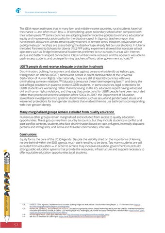 138 UNESCO. 2019. Migration, Displacement and Education. Building Bridges not Walls. Global Education Monitoring Report. p. 171. Retrieved from: https:// en.unesco.org/gem-report/report/2019/migration 139 Romero, M., Sandefur, J. and Sandholtz, W. A. (2017). Can Outsourcing Improve Liberia’s Schools? Preliminary Results from Year One of a Three-Year Randomized Evaluation of Partnership Schools for Liberia. CGD Working Paper 462. Washington, DC: Center for Global Development. Retrieved from: https://www.cgdev. org/publication/partnership-schools-for-liberia 140 Human Rights Watch. LGBTI rights. Retrieved from: http://internap.hrw.org/features/features/lgbt_laws/ 141 See 2015 EI resolution on LGBTI rights: https://ei-ie.org/en/detail/14752/resolution-on-lgbti-rights